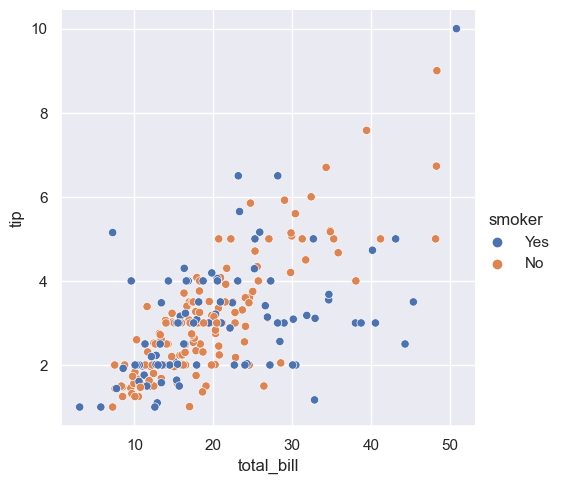 sns.relplot(data=tips, x="total_bill", y="tip", hue="smoker");