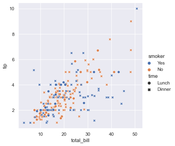 smoker여부와 시간 여부를 각각 색, 모양으로 표시할 수 있다!