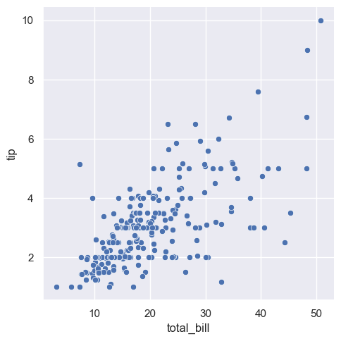 sns.relplot(data=tips, x="total_bill", y="tip");
