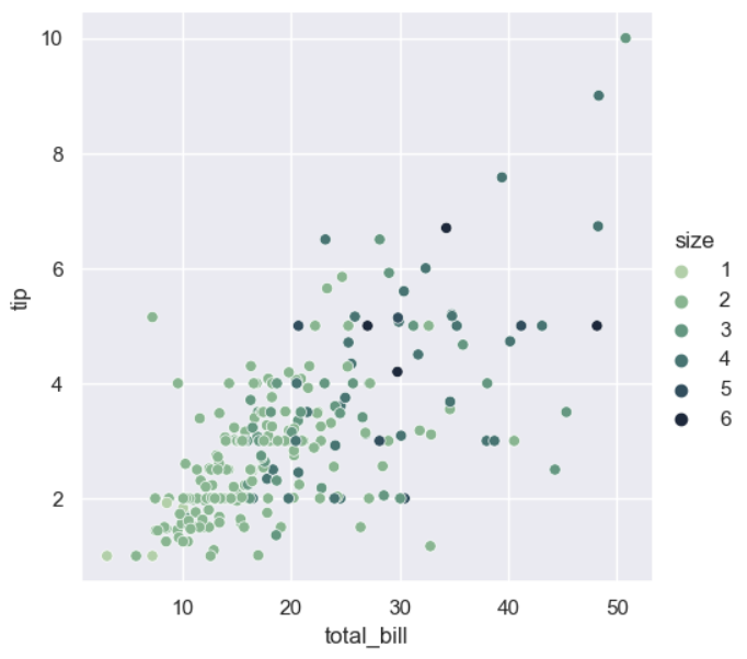 바로 위에서 그려준 산점도에 palette만 "ch:r=-.5,l=.75"로 지정해 주면...