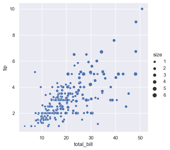 sns.relplot(data=tips, x="total_bill", y="tip", size="size");