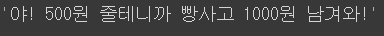 string = '야! ' + data1 + '원 줄테니까 빵사고 ' +data2 + '원 남겨와!'