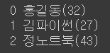 users = ['홍길동(32)', '김파이썬(27)', '정노트북(43)']