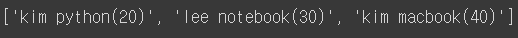 names = ['kim python(23)', 'lee notebook(32)', 'kim macbook(47)']
