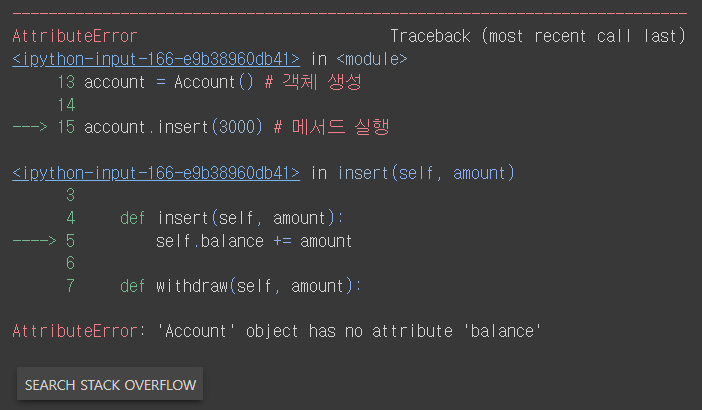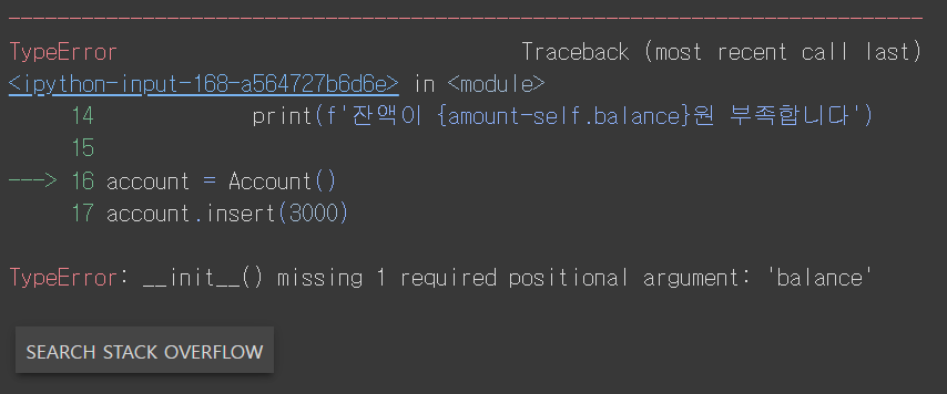 객체가 생성될 때 account = Account()의 괄호 안에 예금을 넣지 않아서 발생하는 오류이다.