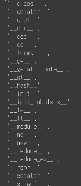 뭐가 잔뜩나오는데... 앞뒤로 __가 들어간 메서드는 객체를 생성할때 자동으로 생성되는 것들이다.