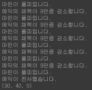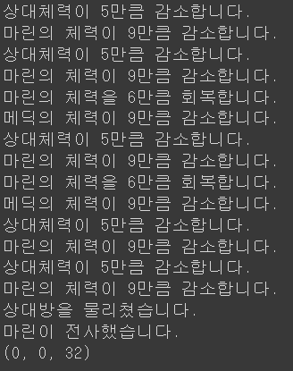 print(f'마린의 체력을 {heal_pow}만큼 회복합니다.') # 죽을때도 회복하다 죽음