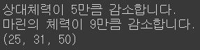print(f'상대체력이 {attack_pow}만큼 감소합니다.') #죽을 때도 때리고 죽음