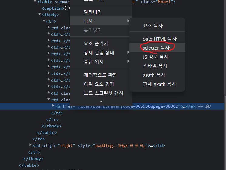 마우스 오른쪽버튼 클릭 후 셀렉터경로를 복사하면...