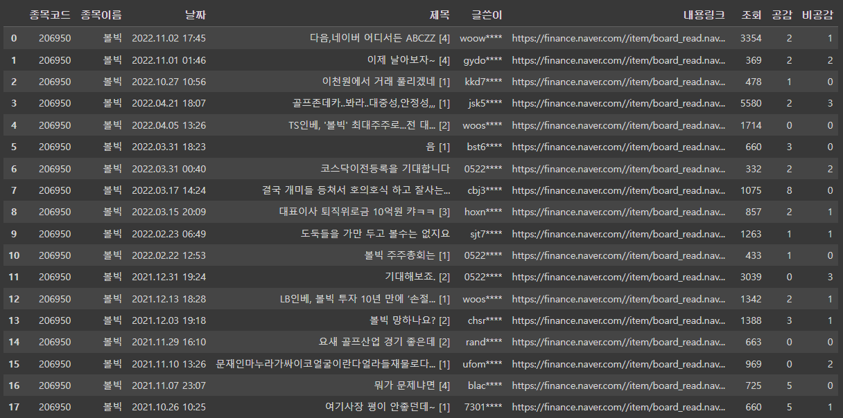 cols = ['종목코드', '종목이름', '제목', '글쓴이','내용링크',
