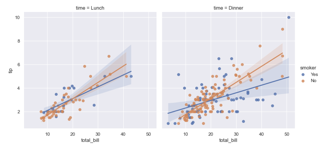 산점도에 더해 선형 회기 모델을 포함해 주는 것을 확인할 수 있다!