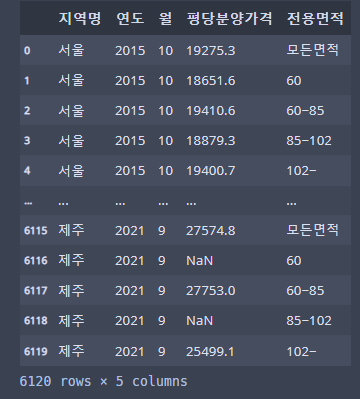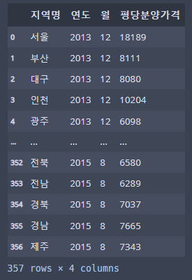 cols = ['지역명', '연도', '월', '평당분양가격']