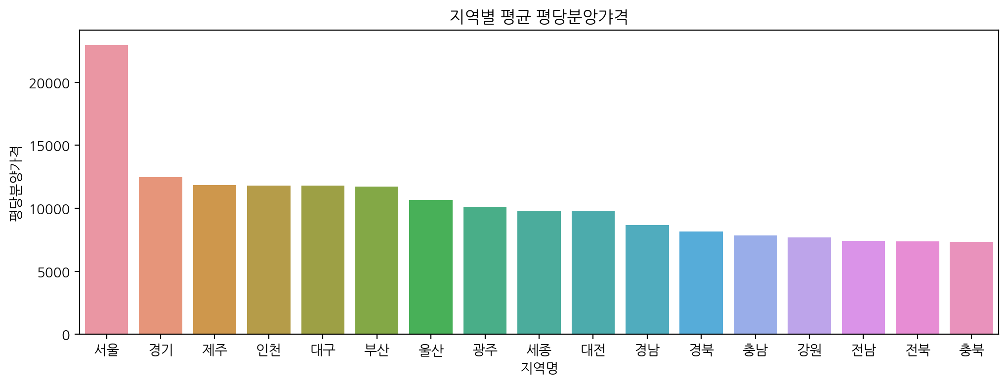 이제 groupby로 지역별 평당분양가격의 평균을 막대그래프로 시각화해보자!