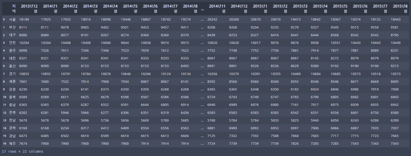 id_vars를 지역명으로 해서 일단 녹여보자!