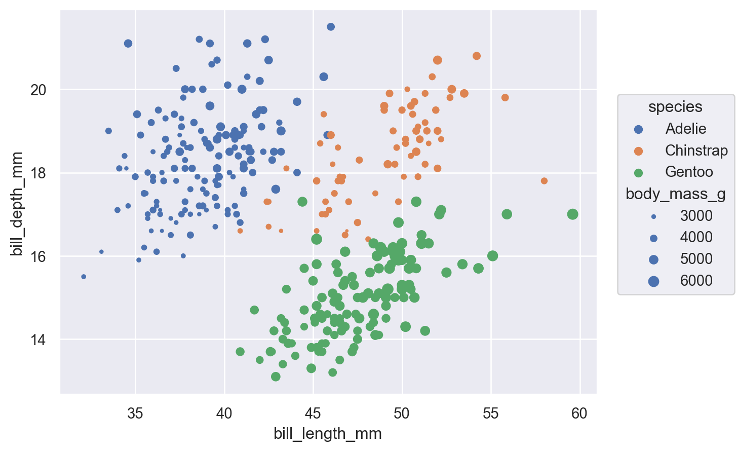 이렇게 Plot에서 color='species', pointsize='body_mass_g'로 설정(해당 데이터를 매핑)하면...