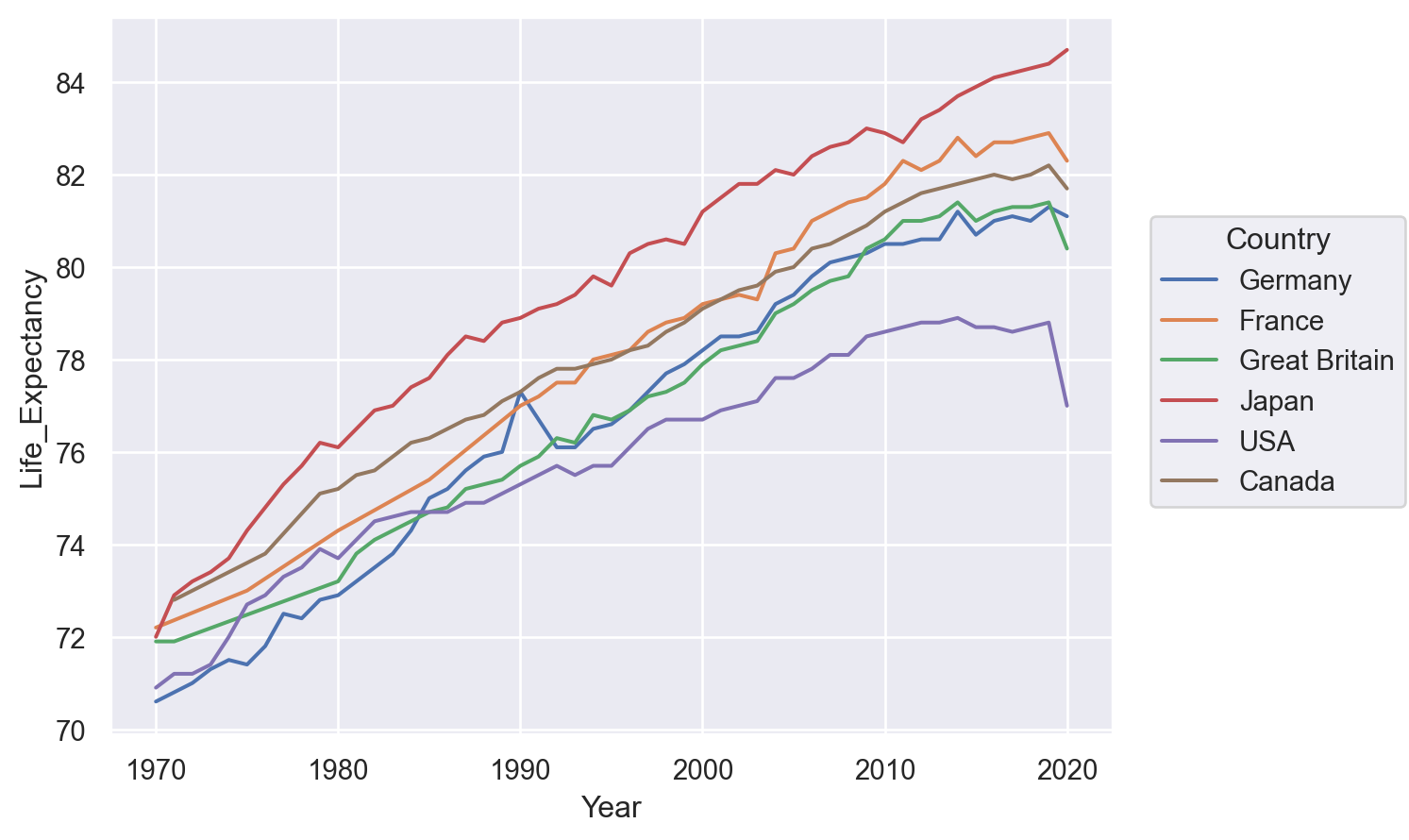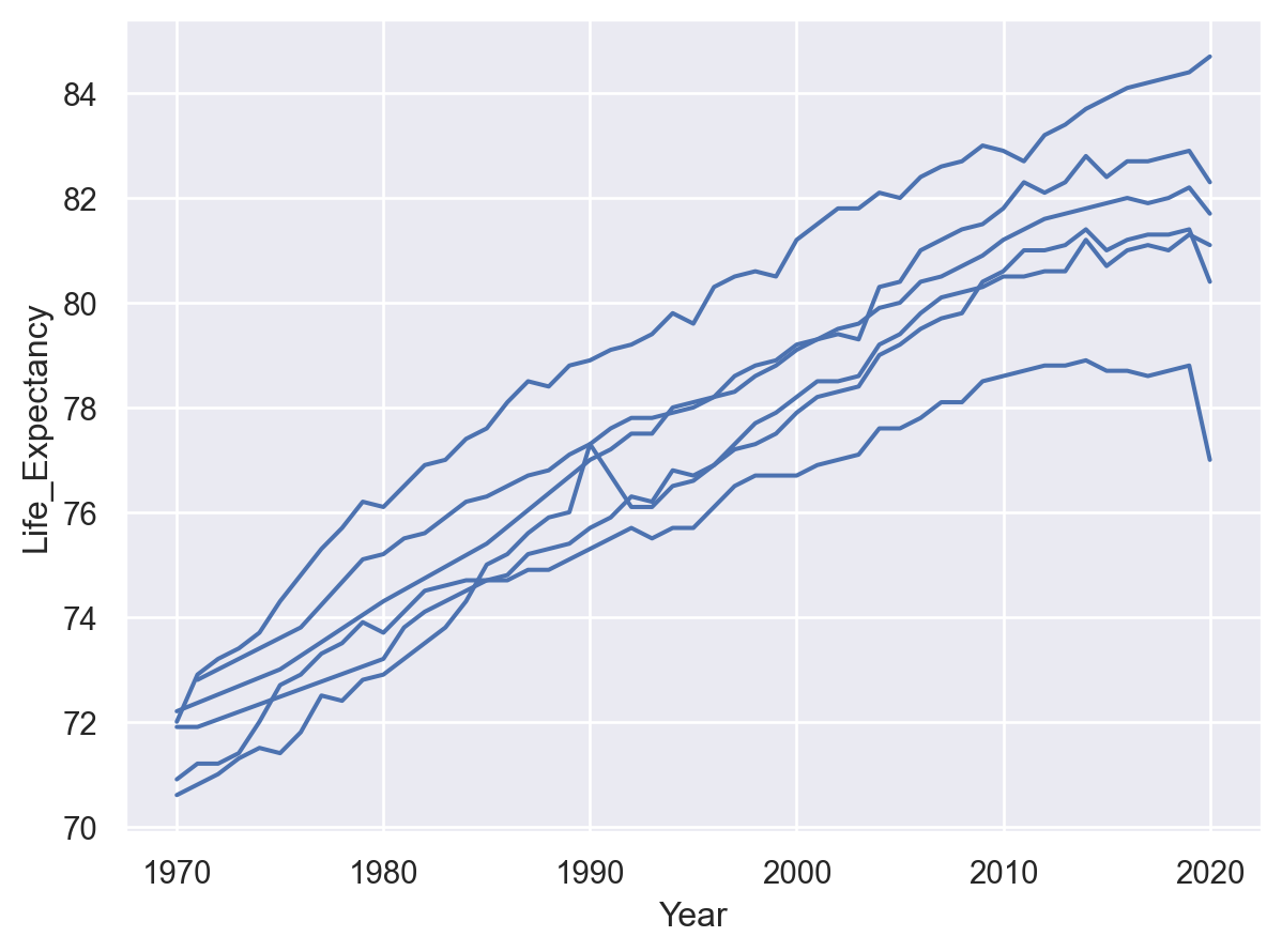 so.Plot(healthexp, x="Year", y="Life_Expectancy", color="Country")