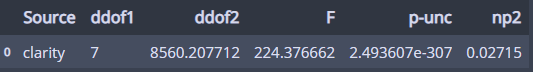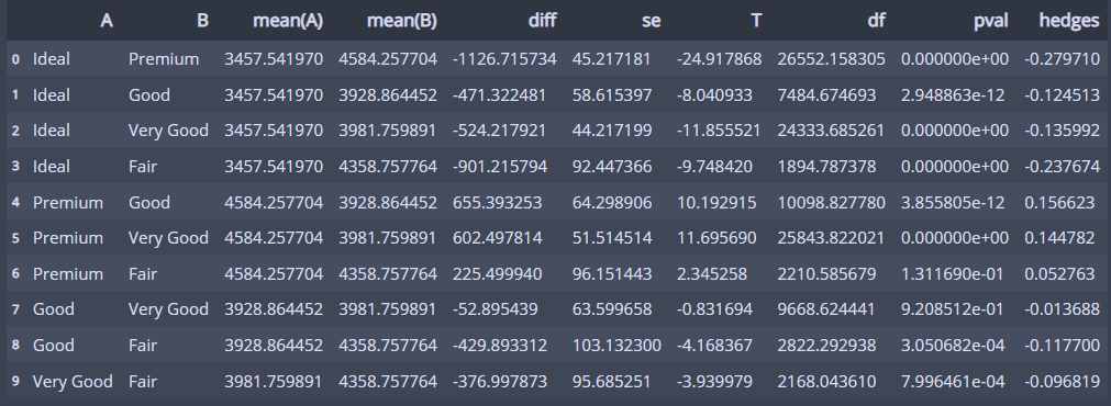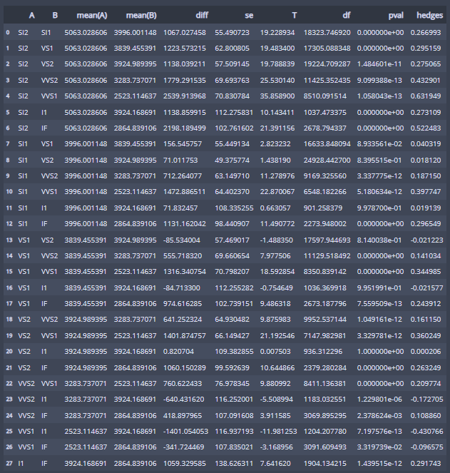 관심 있는 clarity 사이에 가격 평균 차이가 있는지 p_value를 통해 확인해 보면 된다!