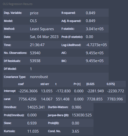 그리고 carat = 7756.4256을 보면 1캐럿이 증가할 때마다 가격이 7756.4256증가한다!