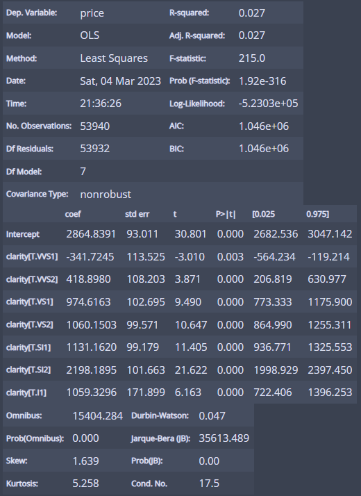 일단 R제곱은... 0.027로 clarity가 가격 분산의 2.7%를 설명한다!