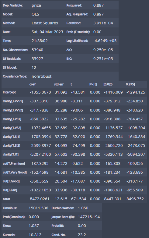 m_carat_clarity_cut = ols('price ~ carat + clarity + cut', df).fit()