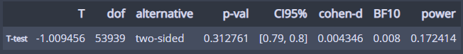 p값이 0.05보다 크기 때문에 결론유보! 캐럿 평균은 0.8과 다르다고 할 수 없다!