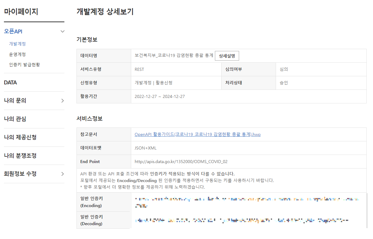 이렇게 마이페이지에 오픈API 개발계정에서 데이터에 대한 인증키를 얻을 수 있습니다.