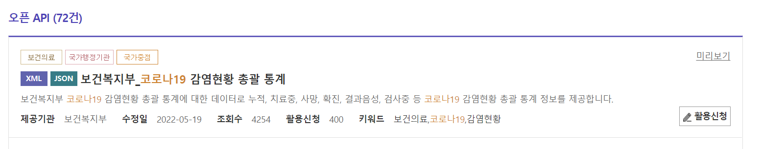저는 '코로나' 키워드로 검색을 해 open api 2페이지에 있는
