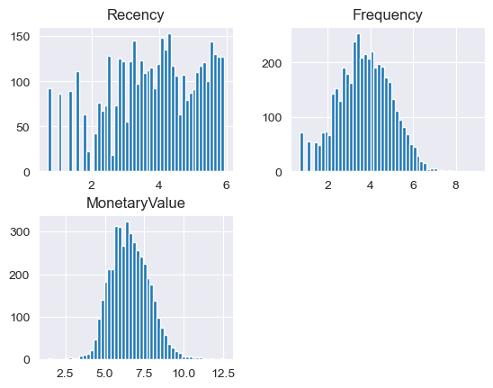 rfm_cluster_log.hist(bins=50);