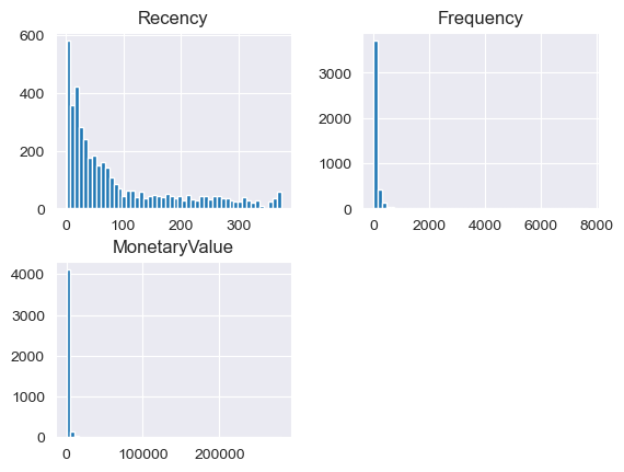 rfm_cluster.hist(bins=50);