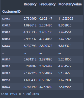 rfm_cluster_log = np.log(rfm_cluster + 1)