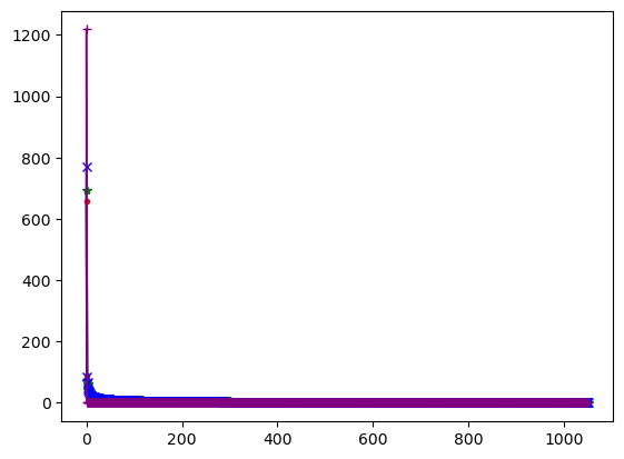 plt.plot(np.linspace(0, 1051, 1051), s[3], color='purple', marker='+')