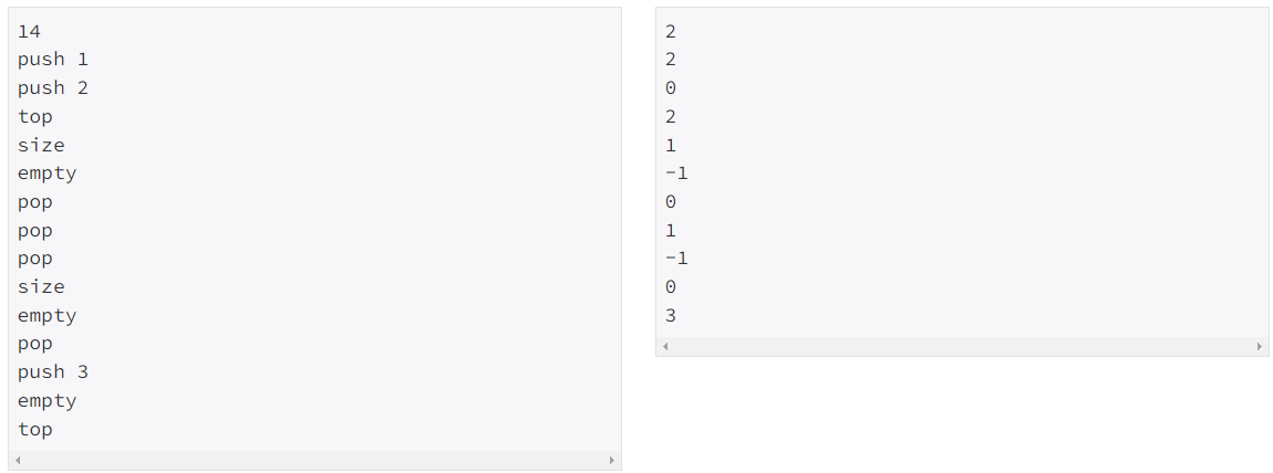 - empty: 스택이 비어있으면 1, 아니면 0을 출력한다.
