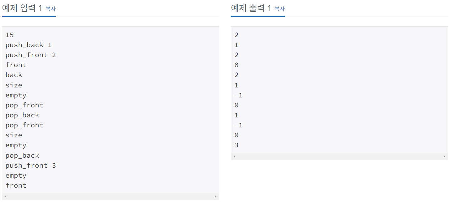 정수를 저장하는 덱(Deque)를 구현한 다음, 입력으로 주어지는 명령을 처리하는 프로그램을 작성하시오.