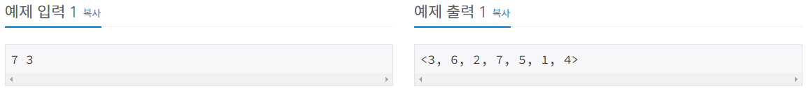 1번부터 N번까지 N명의 사람이 원을 이루면서 앉아있고, 양의 정수 K(≤ N)가 주어진다. 이제 순서대로 K번째 사람을 제거한다. 한 사람이 제거되면 남은 사람들로 이루어진 원을 따라 이 과정을 계속해 나간다. 이 과정은 N명의 사람이 모두 제거될 때까지 계속된다. 원에서 사람들이 제거되는 순서를 (N, K)-요세푸스 순열이라고 한다. 예를 들어 (7, 3)-요세푸스 순열은 <3, 6, 2, 7, 5, 1, 4>이다.