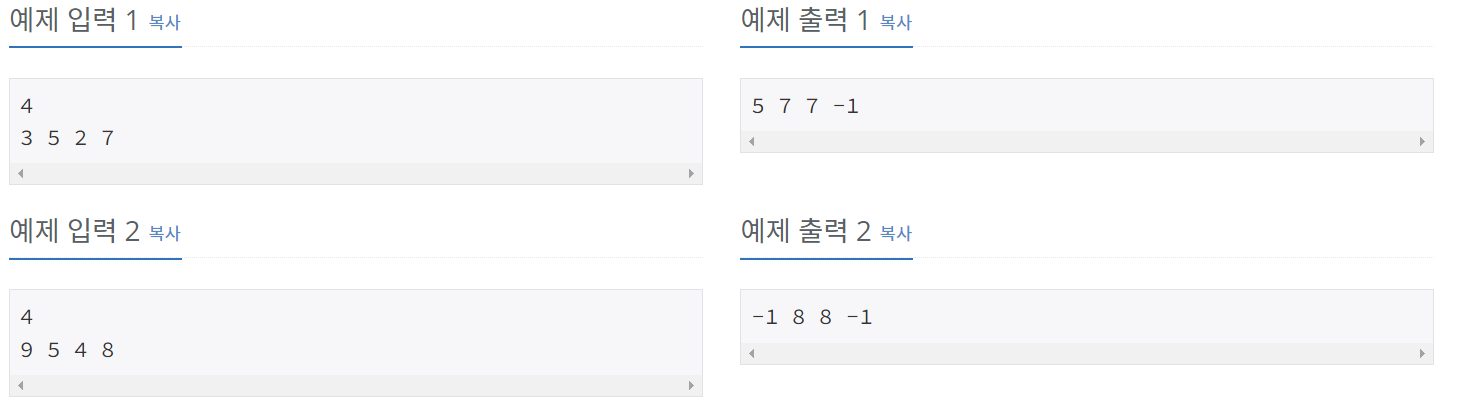 크기가 N인 수열 A = A1, A2, ..., AN이 있다. 수열의 각 원소 Ai에 대해서 오큰수 NGE(i)를 구하려고 한다. Ai의 오큰수는 오른쪽에 있으면서 Ai보다 큰 수 중에서 가장 왼쪽에 있는 수를 의미한다. 그러한 수가 없는 경우에 오큰수는 -1이다.