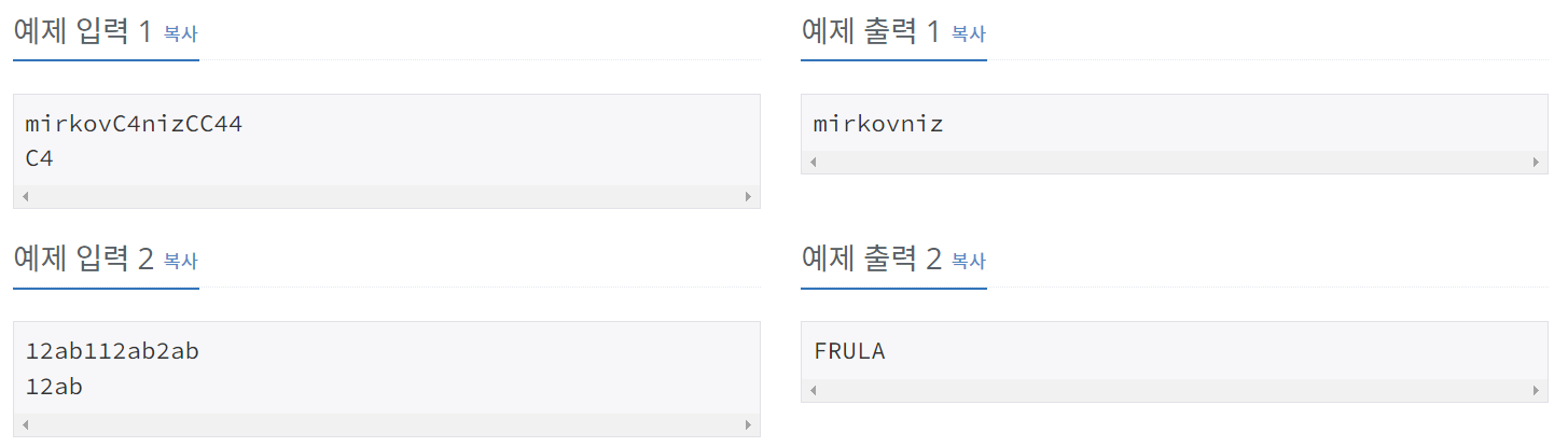 첫째 줄에 문자열이 주어진다. 문자열의 길이는 1보다 크거나 같고, 1,000,000보다 작거나 같다. 둘째 줄에 폭발 문자열이 주어진다. 길이는 1보다 크거나 같고, 36보다 작거나 같다. 두 문자열은 모